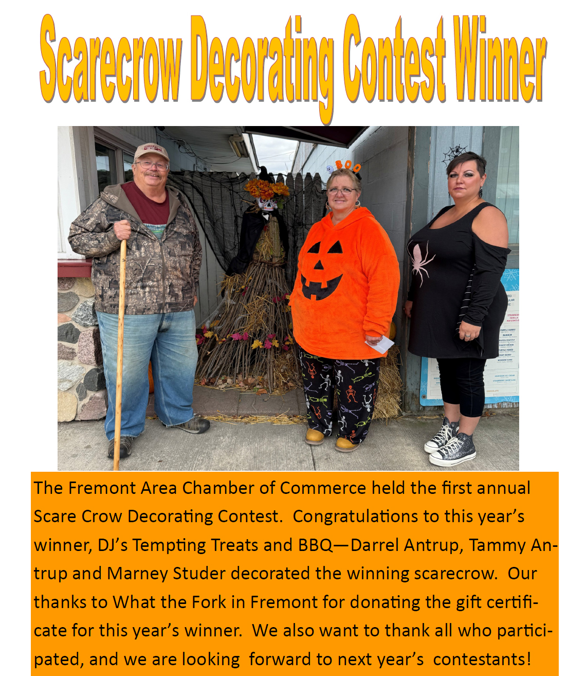 Please take a minute to stroll the downtown to view the scarecrows that are on display from our local businesses. This is the first year for the scarecrow decorating contest and we are happy to have 7 entries. We hope you enjoy the fall displays. Thank you to Fremont Bar & Grill, Cardinal IG, DJ's Tempting Treats & BBQ, Gay's Hops-N-Schnapps, Millie Diane's Quilt Cottage, Rugiano's, and The Unicorn Hair Salon for joining in the fun this year!